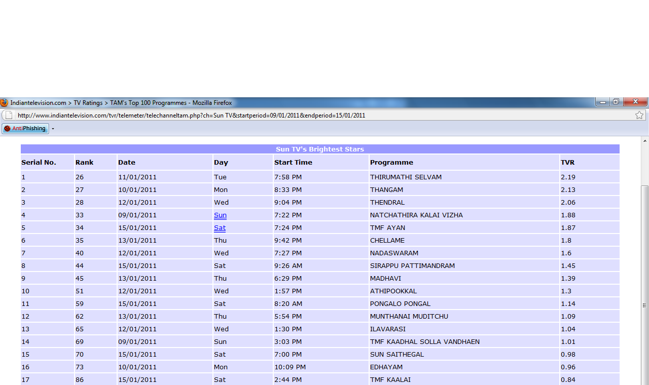 This is snapshot of the TRP details of Sun TV week ending 15th Jan,22 Jan,29 Jan and Mar 3 . Also top 100 programs are also listed.